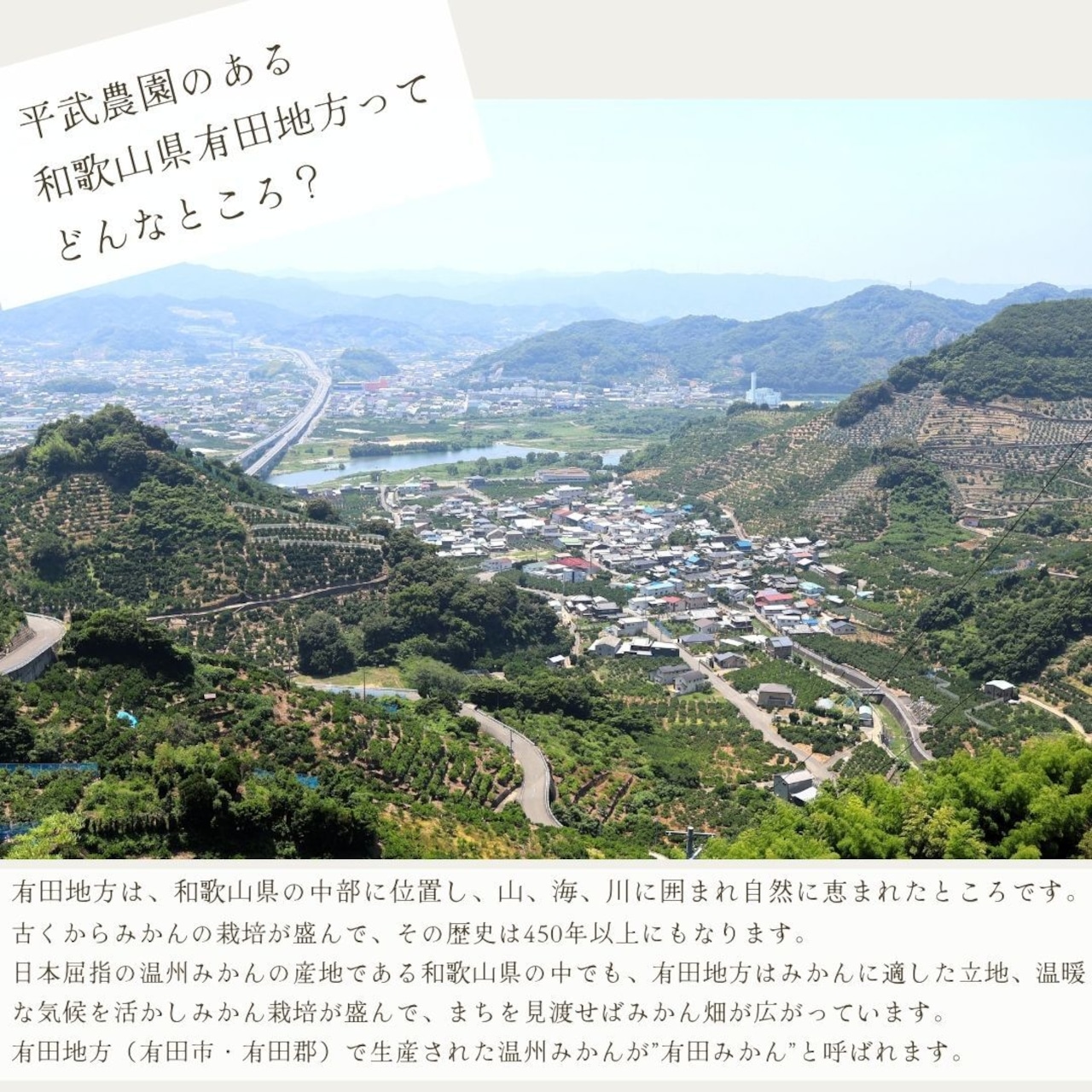 当園は紀伊半島の中部を流れる有田川下流の北岸、和歌山県有田郡の田口地区にあり、古くから有田みかんの産地です